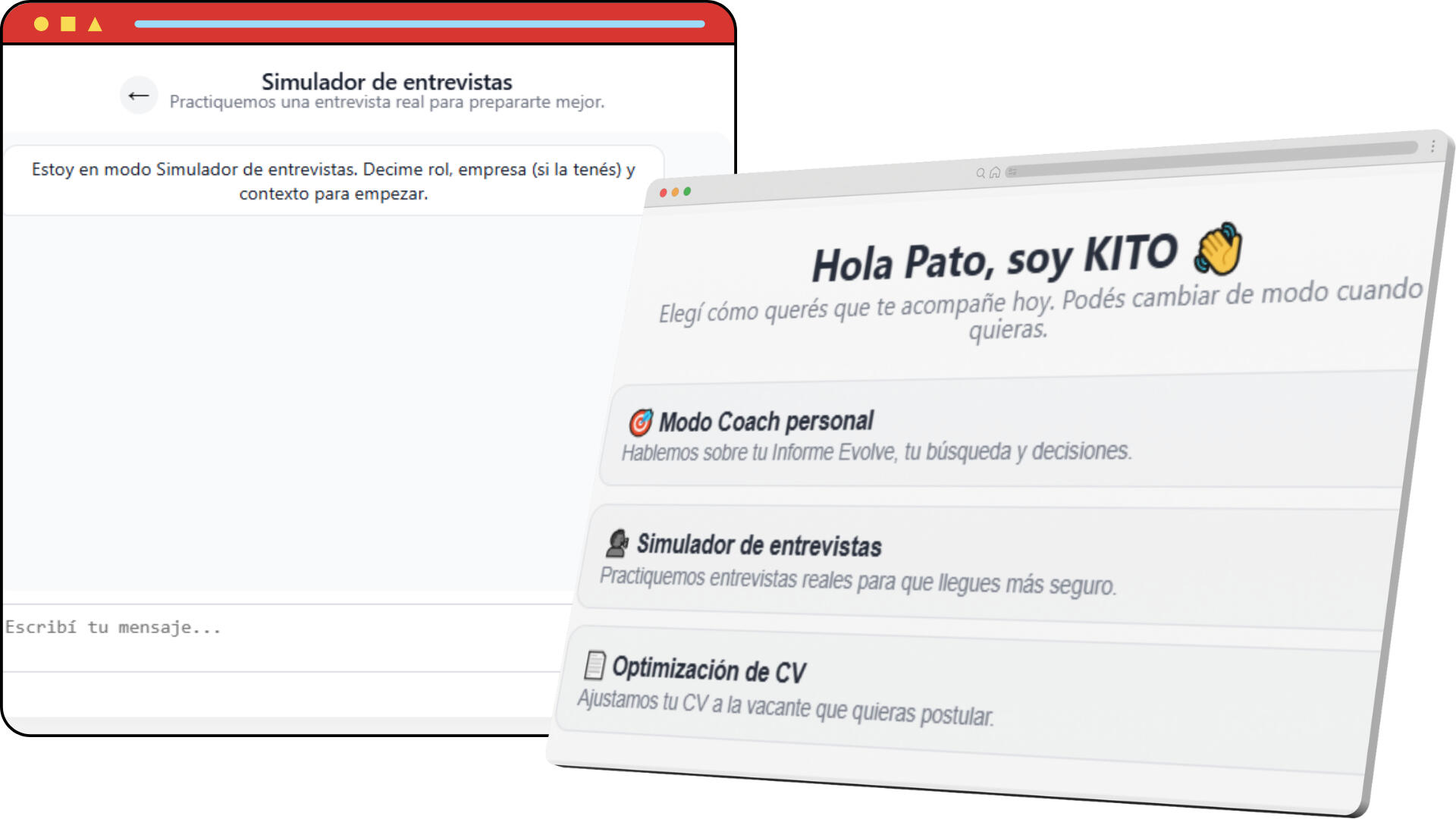Ahí, KITO actúa como tu coach personal y te acompaña en decisiones clave de tu búsqueda laboral: estrategia, CV, entrevistas y próximos pasos.